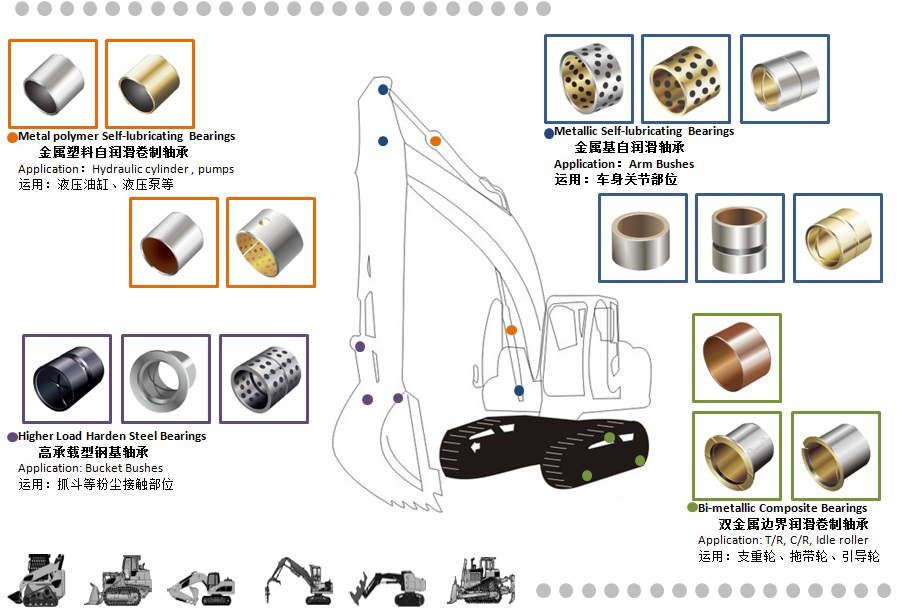 經(jīng)過十多年的努力,公司與各主機廠商配合開發(fā)了適合底盤行走機構、車身件、液壓元件等在內的多種自潤滑軸承材料,包括雙金屬邊界潤滑卷制軸承、金屬基自潤滑 軸承和金屬塑料自潤滑卷制軸承等。這些軸承材料具有在高承載條件下優(yōu)秀的耐磨性能和抗粉塵性能,同時自潤滑技術使得軸承的維護周期大大延長,提高了設備的 利用率,降低了維護成本。