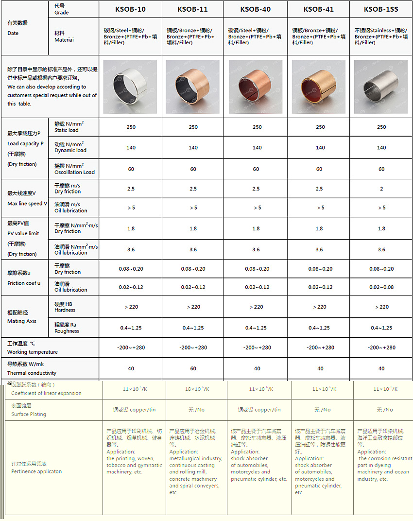 實際運用中根據(jù)使用環(huán)境、工況和環(huán)保要求的不同,低碳鋼板可以改為銅板或不銹鋼板,內(nèi)表面塑料層可以選擇PTFE 含鉛或者不含鉛材料以及其他高分子填充物,外表可以鍍錫或者鍍銅。產(chǎn)品范圍包括:KSOB-10、KSOB-11、KSOB-40、KSOB-41、KSOB-1SS。